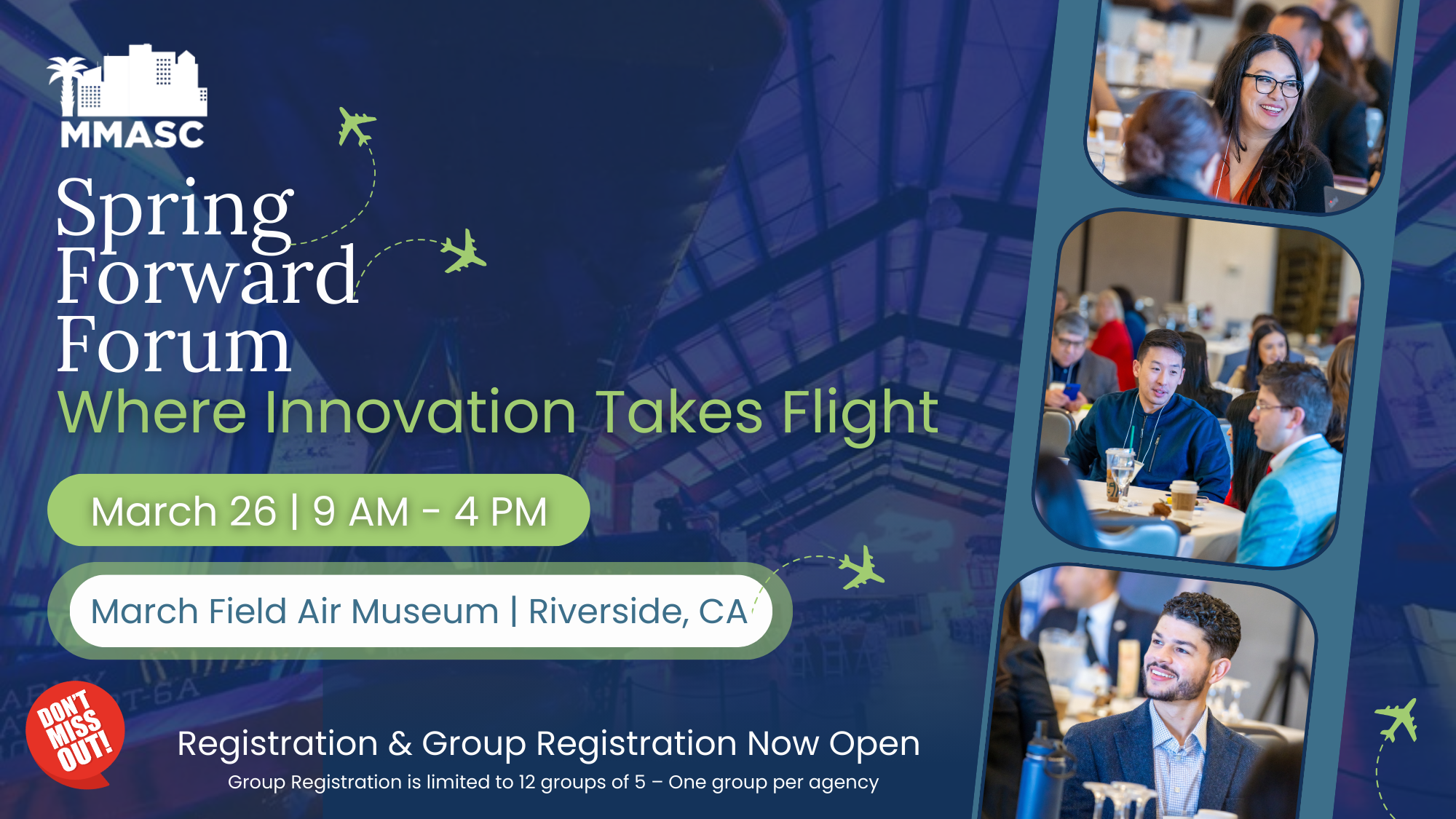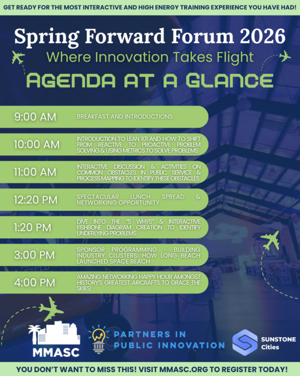 Join MMASC at the Spring Forward Forum: Where Innovation Takes Flight for a high-energy day of learning, collaboration, and connection at the inspiring March Field Air Museum. This year’s program is delivered in partnership with Partners in Public Innovation (PPI), bringing a fresh, hands-on experience designed for real-world local government challenges.